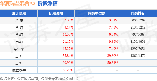 从业绩表现来看,华夏瑞益混合A2基金过去一年净值涨幅为55.84%,在同类基金中排名1362/4479,同类基金过去一年净值涨幅中位数为39.3%。而基金过去一年的最大回撤为-11.77%,成立以来的最大回撤为-21.09%。