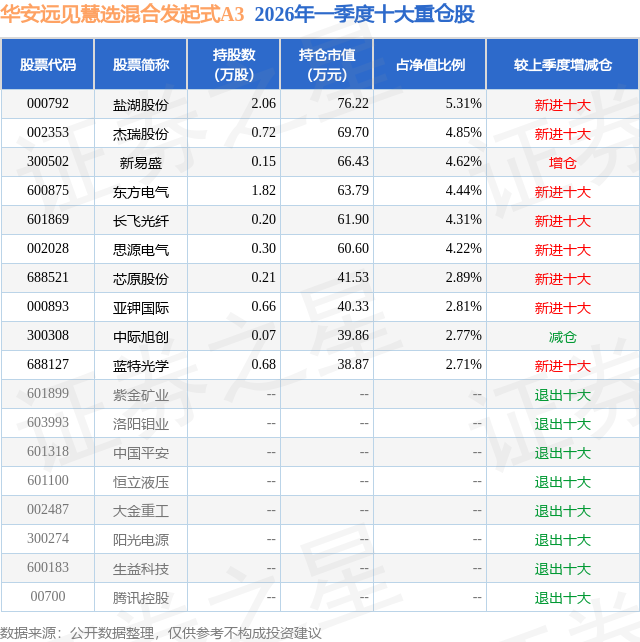 从基金规模来看,华安远见慧选混合发起式A3基金2026年一季度公布的基金规模为0.0亿元,较上一期规模1.01万元变化了0.15万元,环比变化了14.56%。该基金最新一期资产配置为:股票占净值比80.14%,无债券类资产,现金占净值比18.99%。从基金持仓来看,该基金当季前十大股票仓位达38.93%,第一大重仓股为盐湖股份(000792),持仓占比为5.31%。