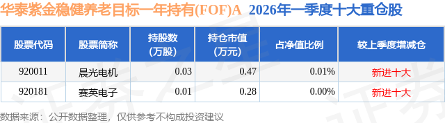 从基金规模来看,华泰紫金稳健养老目标一年持有(FOF)A基金2026年一季度公布的基金规模为0.78亿元,较上一期规模5584.49万元变化了2173.22万元,环比变化了38.92%。该基金最新一期资产配置为:股票占净值比0.01%,债券占净值比5.2%,现金占净值比13.46%。从基金持仓来看,该基金当季前十大股票仓位达0.01%,第一大重仓股为晨光电机(920011),持仓占比为0.01%。