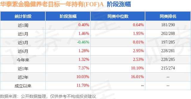 从业绩表现来看,华泰紫金稳健养老目标一年持有(FOF)A基金过去一年净值涨幅为7.37%,在同类基金中排名215/274,同类基金过去一年净值涨幅中位数为10.1%。而基金过去一年的最大回撤为-3.86%,成立以来的最大回撤为-3.86%。