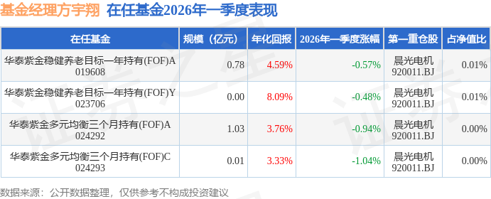 证券之星消息,日前华泰紫金稳健养老目标一年持有(FOF)A基金公布一季报,2026年一季度最新规模0.78亿元,季度净值涨幅为-0.57%。
