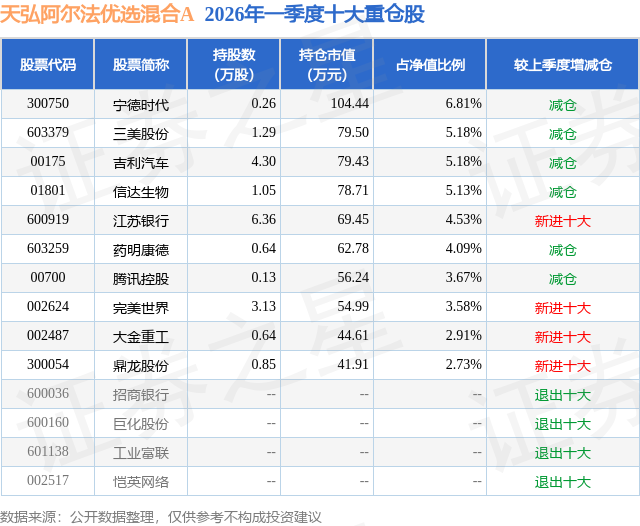 从基金规模来看,天弘阿尔法优选混合A基金2026年一季度公布的基金规模为0.13亿元,较上一期规模506.78万元变化了815.98万元,环比变化了161.01%。该基金最新一期资产配置为:股票占净值比84.04%,无债券类资产,现金占净值比17.35%。从基金持仓来看,该基金当季前十大股票仓位达43.81%,第一大重仓股为宁德时代(300750),持仓占比为6.81%。