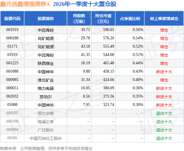 从基金规模来看,鑫元浩鑫增强债券A基金2026年一季度公布的基金规模为5.68亿元,较上一期规模5294.93万元变化了5.15亿元,环比变化了971.93%。该基金最新一期资产配置为:股票占净值比14.71%,债券占净值比82.54%,现金占净值比5.65%。从基金持仓来看,该基金当季前十大股票仓位达4.41%,第一大重仓股为中远海控(601919),持仓占比为0.56%。