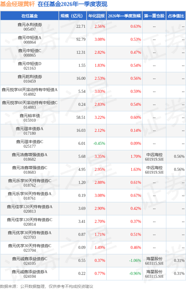 证券之星消息,日前鑫元浩鑫增强债券C基金公布一季报,2026年一季度最新规模4.95亿元,季度净值涨幅为1.63%。