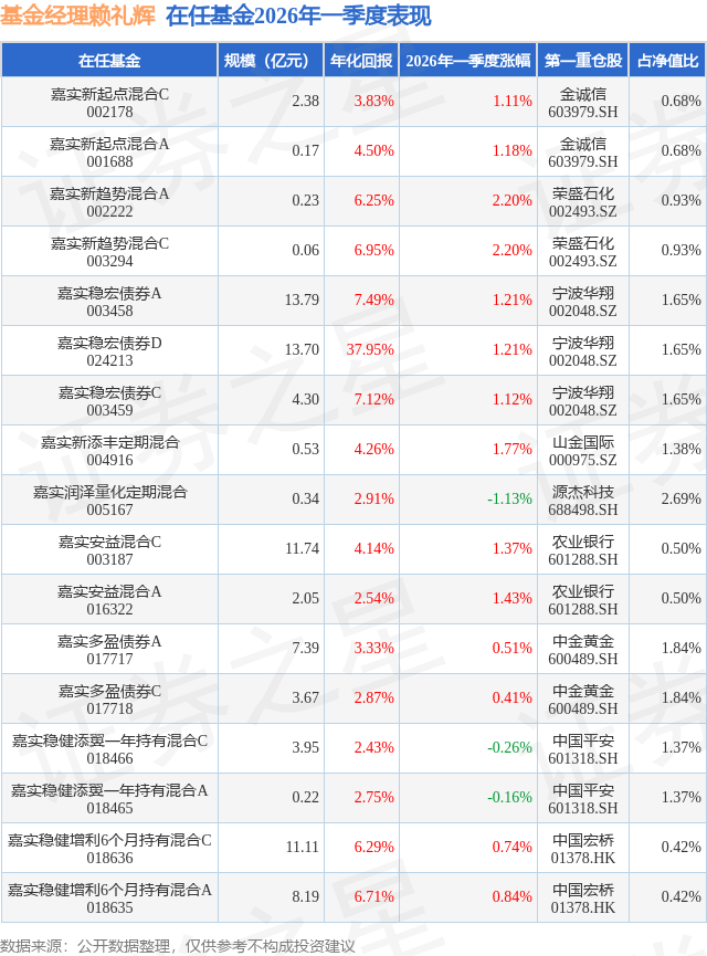 证券之星消息,日前嘉实稳健增利6个月持有混合A基金公布一季报,2026年一季度最新规模8.19亿元,季度净值涨幅为0.84%。