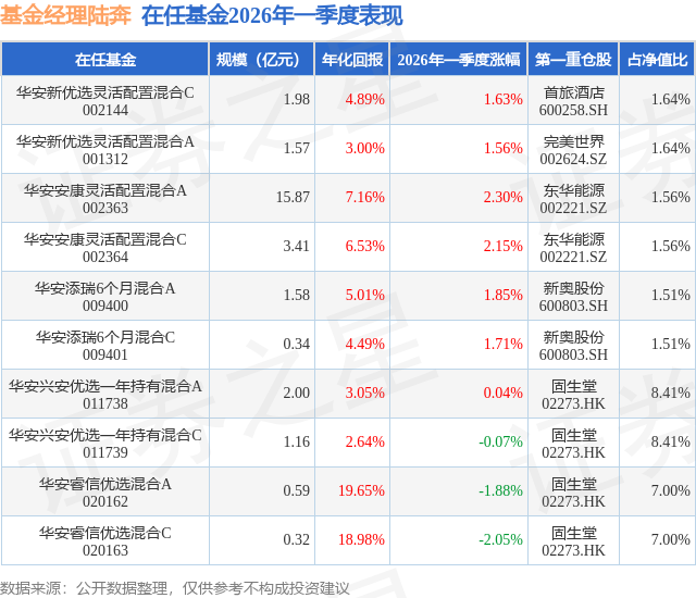从基金规模来看,华安睿信优选混合A基金2026年一季度公布的基金规模为0.59亿元,较上一期规模3376.56万元变化了2550.5万元,环比变化了75.54%。该基金最新一期资产配置为:股票占净值比86.27%,无债券类资产,现金占净值比12.89%。从基金持仓来看,该基金当季前十大股票仓位达39.49%,第一大重仓股为固生堂(02273),持仓占比为7.0%。