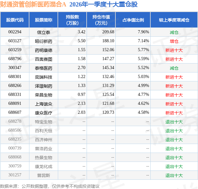 从基金规模来看,财通资管创新医药混合A基金2026年一季度公布的基金规模为0.05亿元,较上一期规模994.75万元变化了-444.97万元,环比变化了-44.73%。该基金最新一期资产配置为:股票占净值比89.92%,无债券类资产,现金占净值比7.77%。从基金持仓来看,该基金当季前十大股票仓位达55.97%,第一大重仓股为信立泰(002294),持仓占比为7.96%。