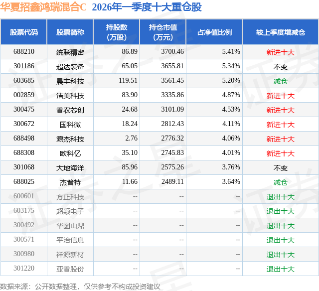 从基金规模来看,华夏招鑫鸿瑞混合C基金2026年一季度公布的基金规模为3.62亿元,较上一期规模2697.69万元变化了3.35亿元,环比变化了1242.36%。该基金最新一期资产配置为:股票占净值比72.96%,债券占净值比0.28%,现金占净值比29.98%。从基金持仓来看,该基金当季前十大股票仓位达44.93%,第一大重仓股为统联精密(688210),持仓占比为5.41%。