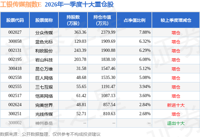 从基金规模来看,工银传媒指数E基金2026年一季度公布的基金规模为0.38亿元,较上一期规模927.65万元变化了2897.47万元,环比变化了312.35%。该基金最新一期资产配置为:股票占净值比93.82%,无债券类资产,现金占净值比6.81%。从基金持仓来看,该基金当季前十大股票仓位达49.83%,第一大重仓股为分众传媒(002027),持仓占比为7.88%。