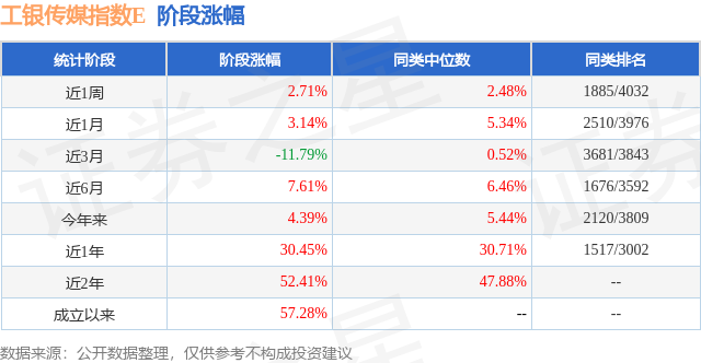 从业绩表现来看,工银传媒指数E基金过去一年净值涨幅为30.45%,在同类基金中排名1517/3002,同类基金过去一年净值涨幅中位数为30.71%。而基金过去一年的最大回撤为-24.96%,成立以来的最大回撤为-29.06%。