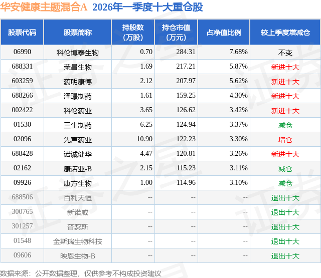 从基金规模来看,华安健康主题混合A基金2026年一季度公布的基金规模为0.15亿元,较上一期规模848.95万元变化了665.49万元,环比变化了78.39%。该基金最新一期资产配置为:股票占净值比91.27%,债券占净值比1.92%,现金占净值比5.86%。从基金持仓来看,该基金当季前十大股票仓位达43.03%,第一大重仓股为科伦博泰生物(06990),持仓占比为7.68%。