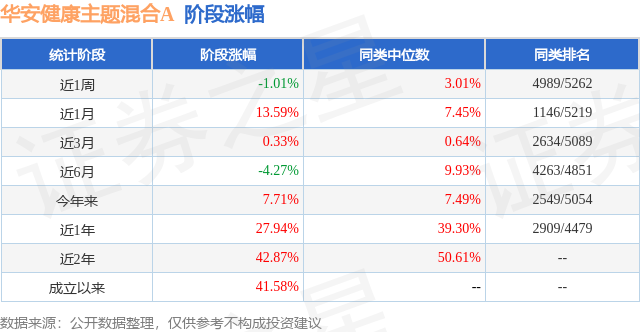 从业绩表现来看,华安健康主题混合A基金过去一年净值涨幅为27.94%,在同类基金中排名2909/4479,同类基金过去一年净值涨幅中位数为39.3%。而基金过去一年的最大回撤为-29.59%,成立以来的最大回撤为-29.59%。