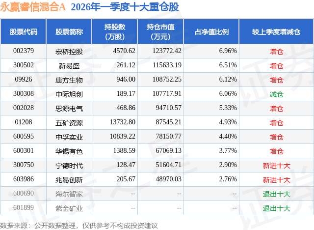 从基金规模来看,永赢睿信混合A基金2026年一季度公布的基金规模为59.94亿元,较上一期规模5.7亿元变化了54.24亿元,环比变化了952.4%。该基金最新一期资产配置为:股票占净值比92.32%,债券占净值比0.03%,现金占净值比10.5%。从基金持仓来看,该基金当季前十大股票仓位达49.74%,第一大重仓股为宏桥控股(002379),持仓占比为6.96%。