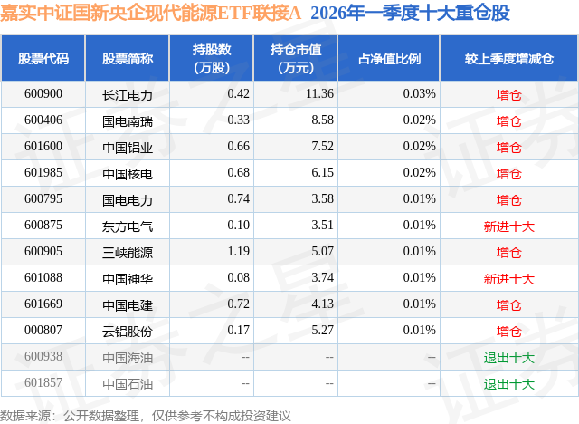 从基金规模来看,嘉实中证国新央企现代能源ETF联接A基金2026年一季度公布的基金规模为0.54亿元,较上一期规模2108.11万元变化了3313.04万元,环比变化了157.16%。该基金最新一期资产配置为:股票占净值比0.3%,无债券类资产,现金占净值比6.97%。从基金持仓来看,该基金当季前十大股票仓位达0.15%,第一大重仓股为长江电力(600900),持仓占比为0.03%。