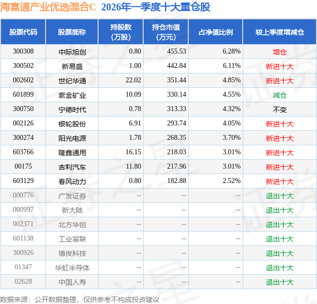 从基金规模来看,海富通产业优选混合C基金2026年一季度公布的基金规模为0.26亿元,较上一期规模4579.27万元变化了-1984.1万元,环比变化了-43.33%。该基金最新一期资产配置为:股票占净值比83.25%,无债券类资产,现金占净值比16.97%。从基金持仓来看,该基金当季前十大股票仓位达42.4%,第一大重仓股为中际旭创(300308),持仓占比为6.28%。