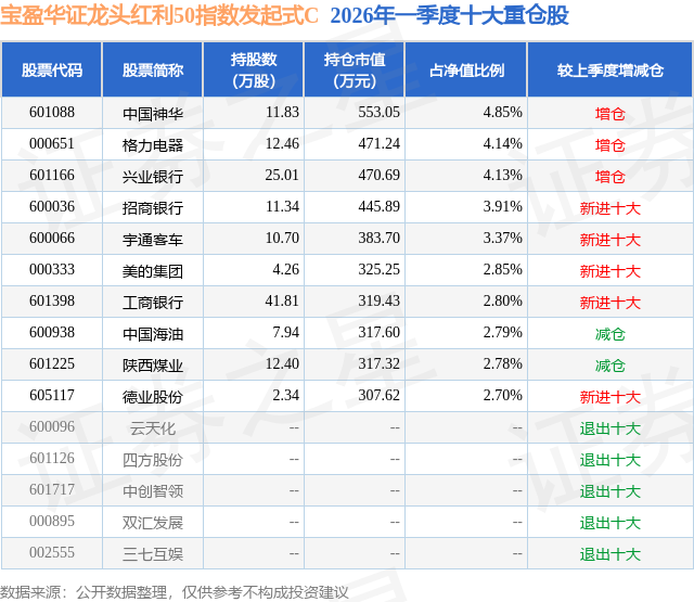 从基金规模来看,宝盈华证龙头红利50指数发起式C基金2026年一季度公布的基金规模为0.52亿元,较上一期规模4351.94万元变化了840.31万元,环比变化了19.31%。该基金最新一期资产配置为:股票占净值比94.9%,债券占净值比1.68%,现金占净值比4.24%。从基金持仓来看,该基金当季前十大股票仓位达34.32%,第一大重仓股为中国神华(601088),持仓占比为4.85%。