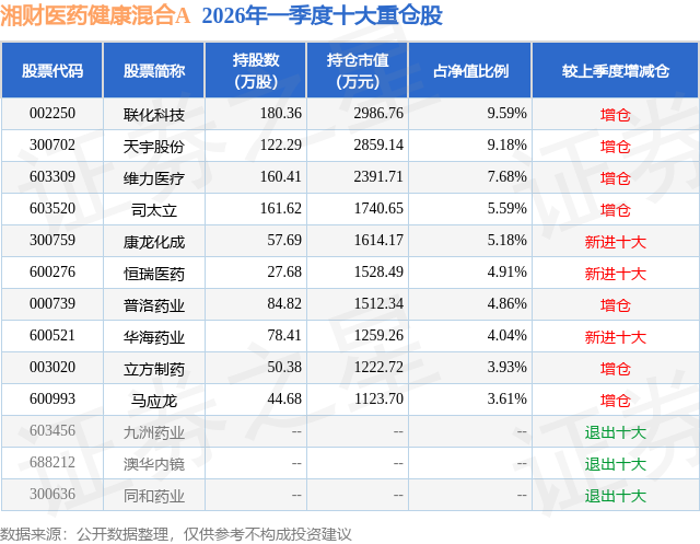 证券之星消息,日前湘财医药健康混合A基金公布一季报,2026年一季度最新规模0.4亿元,季度净值涨幅为8.31%。
