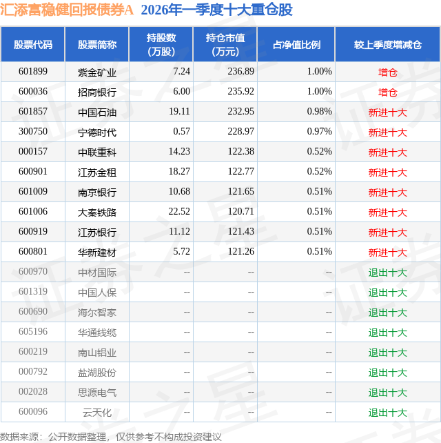 从基金规模来看,汇添富稳健回报债券A基金2026年一季度公布的基金规模为1.49亿元,较上一期规模4236.91万元变化了1.07亿元,环比变化了252.32%。该基金最新一期资产配置为:股票占净值比17.29%,债券占净值比90.57%,现金占净值比11.7%。从基金持仓来看,该基金当季前十大股票仓位达7.03%,第一大重仓股为紫金矿业(601899),持仓占比为1.0%。