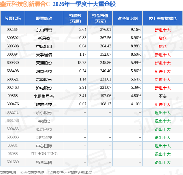 证券之星消息,日前鑫元科技创新混合C基金公布一季报,2026年一季度最新规模0.03亿元,季度净值涨幅为-8.35%。