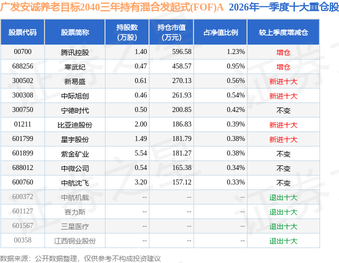 从基金规模来看,广发安诚养老目标2040三年持有混合发起式(FOF)A基金2026年一季度公布的基金规模为3.78亿元,较上一期规模3.38亿元变化了4026.88万元,环比变化了11.91%。该基金最新一期资产配置为:股票占净值比7.42%,债券占净值比4.69%,现金占净值比1.42%。从基金持仓来看,该基金当季前十大股票仓位达5.52%,第一大重仓股为腾讯控股(00700),持仓占比为1.23%。