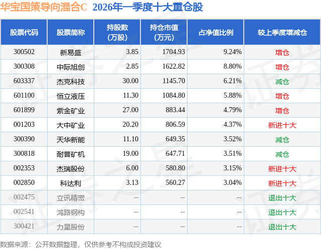 从基金规模来看,华宝国策导向混合C基金2026年一季度公布的基金规模为0.0亿元,较上一期规模217.54万元变化了-198.81万元,环比变化了-91.39%。该基金最新一期资产配置为:股票占净值比81.24%,无债券类资产,现金占净值比18.27%。从基金持仓来看,该基金当季前十大股票仓位达52.51%,第一大重仓股为新易盛(300502),持仓占比为9.24%。