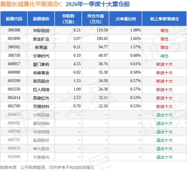 从基金规模来看,景顺长城量化平衡混合C基金2026年一季度公布的基金规模为0.03亿元,较上一期规模1.67万元变化了274.85万元,环比变化了16442.61%。该基金最新一期资产配置为:股票占净值比93.52%,债券占净值比0.01%,现金占净值比6.56%。从基金持仓来看,该基金当季前十大股票仓位达9.28%,第一大重仓股为中际旭创(300308),持仓占比为1.98%。