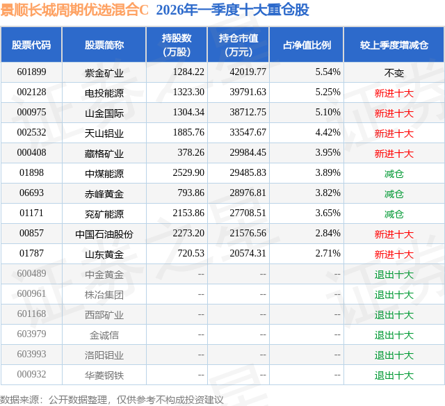 从基金规模来看,景顺长城周期优选混合C基金2026年一季度公布的基金规模为45.61亿元,较上一期规模2.96亿元变化了42.64亿元,环比变化了1439.61%。该基金最新一期资产配置为:股票占净值比85.14%,无债券类资产,现金占净值比14.71%。从基金持仓来看,该基金当季前十大股票仓位达41.17%,第一大重仓股为紫金矿业(601899),持仓占比为5.54%。