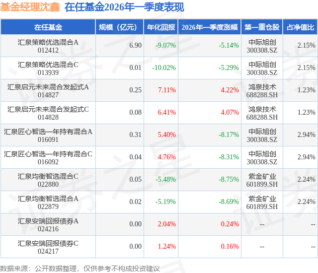 证券之星消息,日前汇泉启元未来混合发起式A基金公布一季报,2026年一季度最新规模0.25亿元,季度净值涨幅为4.22%。