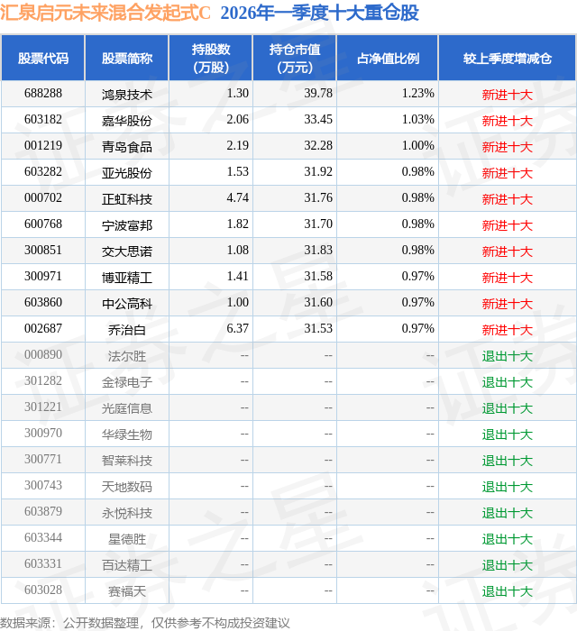证券之星消息,日前汇泉启元未来混合发起式C基金公布一季报,2026年一季度最新规模0.08亿元,季度净值涨幅为4.07%。