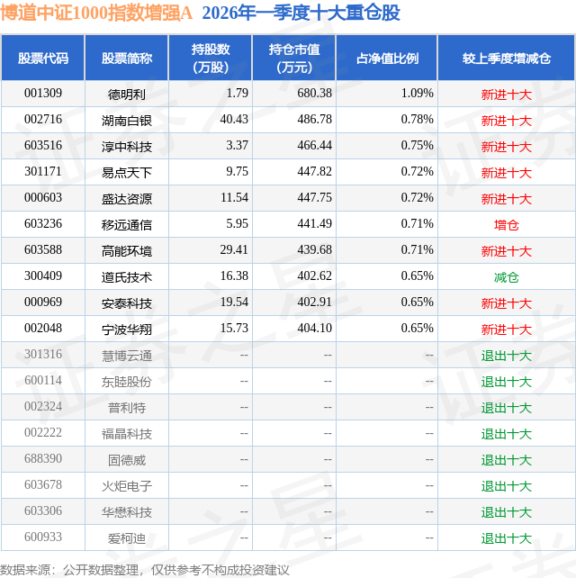从基金规模来看,博道中证1000指数增强A基金2026年一季度公布的基金规模为2.88亿元,较上一期规模7820.62万元变化了2.1亿元,环比变化了267.91%。该基金最新一期资产配置为:股票占净值比93.47%,债券占净值比5.76%,现金占净值比2.82%。从基金持仓来看,该基金当季前十大股票仓位达7.43%,第一大重仓股为德明利(001309),持仓占比为1.09%。