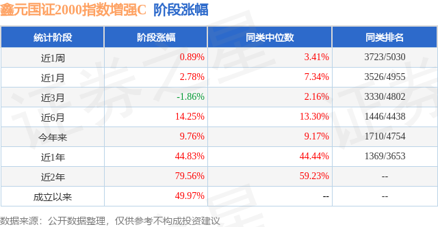从业绩表现来看,鑫元国证2000指数增强C基金过去一年净值涨幅为44.83%,在同类基金中排名1369/3653,同类基金过去一年净值涨幅中位数为44.44%。而基金过去一年的最大回撤为-11.6%,成立以来的最大回撤为-33.75%。