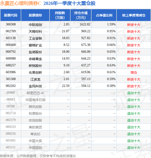 从基金规模来看,永赢匠心增利债券C基金2026年一季度公布的基金规模为1.74亿元,较上一期规模2974.07万元变化了1.44亿元,环比变化了485.68%。该基金最新一期资产配置为:股票占净值比18.25%,债券占净值比92.84%,现金占净值比4.75%。从基金持仓来看,该基金当季前十大股票仓位达7.8%,第一大重仓股为中际旭创(300308),持仓占比为1.59%。