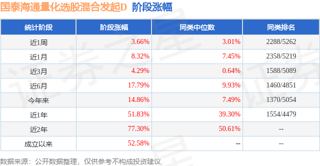 证券之星消息,日前国泰海通量化选股混合发起D基金公布一季报,2026年一季度最新规模6.44亿元,季度净值涨幅为4.28%。