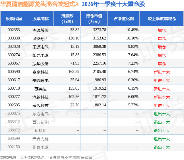 从基金规模来看,华夏清洁能源龙头混合发起式A基金2026年一季度公布的基金规模为0.76亿元,较上一期规模6678.22万元变化了964.65万元,环比变化了14.44%。该基金最新一期资产配置为:股票占净值比92.21%,无债券类资产,现金占净值比11.21%。从基金持仓来看,该基金当季前十大股票仓位达76.31%,第一大重仓股为杰瑞股份(002353),持仓占比为10.49%。