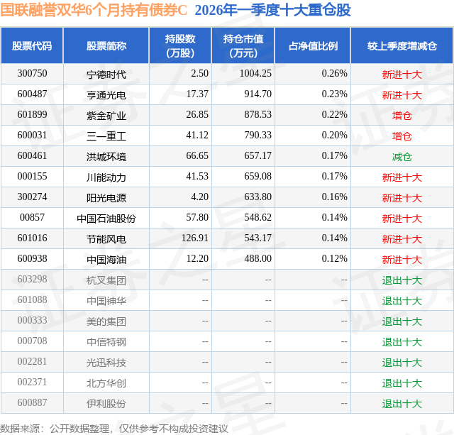 从基金规模来看,国联融誉双华6个月持有债券C基金2026年一季度公布的基金规模为17.42亿元,较上一期规模1.45亿元变化了15.97亿元,环比变化了1099.86%。该基金最新一期资产配置为:股票占净值比6.42%,债券占净值比119.53%,现金占净值比2.11%。从基金持仓来看,该基金当季前十大股票仓位达1.81%,第一大重仓股为宁德时代(300750),持仓占比为0.26%。