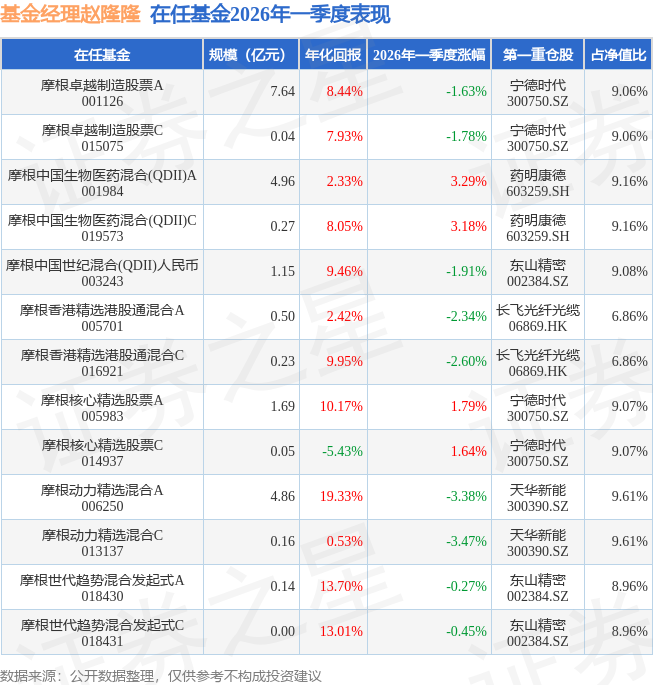 证券之星消息,日前摩根世代趋势混合发起式C基金公布一季报,2026年一季度最新规模0.0亿元,季度净值涨幅为-0.45%。