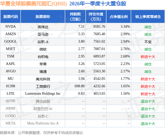 从基金规模来看,华夏全球股票美元现汇(QDII)基金2026年一季度公布的基金规模为25.69亿元,较上一期规模22.19亿元变化了3.49亿元,环比变化了15.75%。该基金最新一期资产配置为:股票占净值比83.75%,无债券类资产,现金占净值比6.29%。从基金持仓来看,该基金当季前十大股票仓位达24.09%,第一大重仓股为英伟达(NVDA),持仓占比为3.34%。