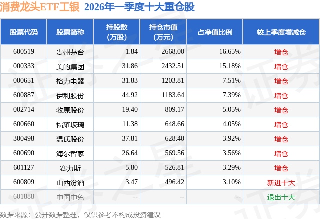从基金规模来看,消费龙头ETF工银基金2026年一季度公布的基金规模为1.6亿元,较上一期规模1.67亿元变化了-630.1万元,环比变化了-3.78%。该基金最新一期资产配置为:股票占净值比99.43%,无债券类资产,现金占净值比0.59%。从基金持仓来看,该基金当季前十大股票仓位达69.7%,第一大重仓股为贵州茅台(600519),持仓占比为16.65%。