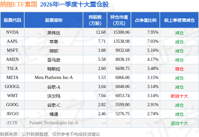 从基金规模来看,纳指ETF富国基金2026年一季度公布的基金规模为19.26亿元,较上一期规模20.2亿元变化了-9479.48万元,环比变化了-4.69%。该基金最新一期资产配置为:股票占净值比90.32%,无债券类资产,现金占净值比7.95%。从基金持仓来看,该基金当季前十大股票仓位达42.87%,第一大重仓股为英伟达(NVDA),持仓占比为7.95%。