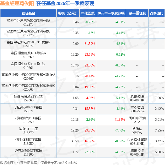 证券之星消息,日前纳指ETF富国基金公布一季报,2026年一季度最新规模19.26亿元,季度净值涨幅为-7.4%。