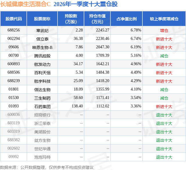 从基金规模来看,长城健康生活混合C基金2026年一季度公布的基金规模为0.09亿元,较上一期规模1.95万元变化了941.94万元,环比变化了48353.76%。该基金最新一期资产配置为:股票占净值比78.46%,无债券类资产,现金占净值比24.14%。从基金持仓来看,该基金当季前十大股票仓位达49.61%,第一大重仓股为寒武纪(688256),持仓占比为6.78%。