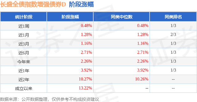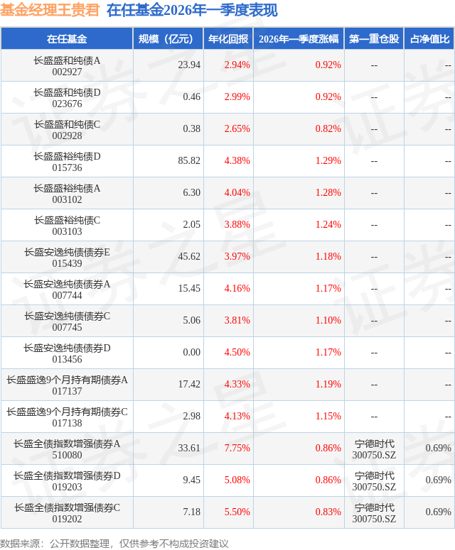 证券之星消息,日前长盛全债指数增强债券D基金公布一季报,2026年一季度最新规模9.45亿元,季度净值涨幅为0.86%。