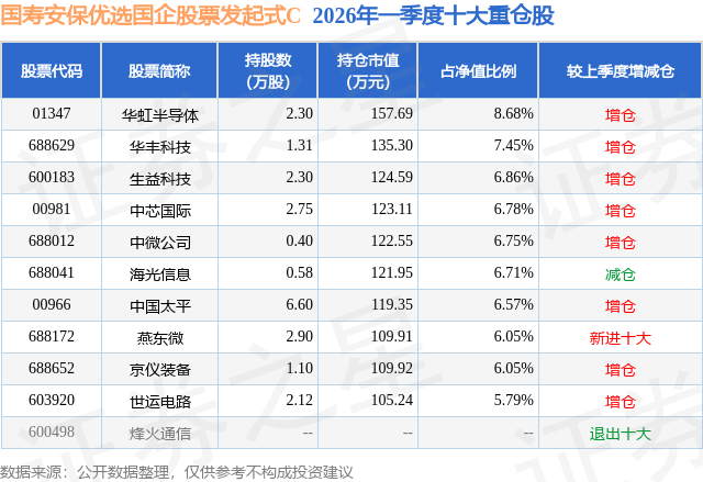 从基金规模来看,国寿安保优选国企股票发起式C基金2026年一季度公布的基金规模为0.01亿元,较上一期规模160.21万元变化了-29.74万元,环比变化了-18.56%。该基金最新一期资产配置为:股票占净值比93.94%,债券占净值比1.12%,现金占净值比6.29%。从基金持仓来看,该基金当季前十大股票仓位达67.69%,第一大重仓股为华虹半导体(01347),持仓占比为8.68%。