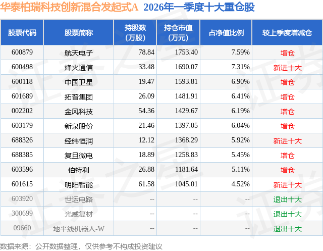 证券之星消息,日前华泰柏瑞科技创新混合发起式A基金公布一季报,2026年一季度最新规模0.27亿元,季度净值涨幅为-7.58%。