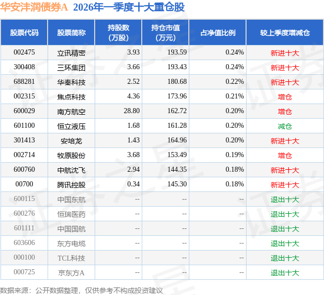 证券之星消息,日前华安沣润债券A基金公布一季报,2026年一季度最新规模7.39亿元,季度净值涨幅为-0.3%。