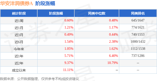 从业绩表现来看,华安沣润债券A基金过去一年净值涨幅为5.71%,在同类基金中排名737/1286,同类基金过去一年净值涨幅中位数为6.4%。而基金过去一年的最大回撤为-1.28%,成立以来的最大回撤为-1.28%。