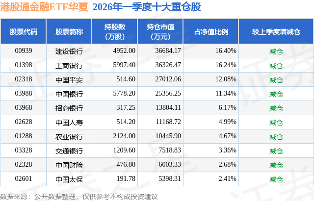 从基金规模来看,港股通金融ETF华夏基金2026年一季度公布的基金规模为22.37亿元,较上一期规模25.39亿元变化了-3.02亿元,环比变化了-11.9%。该基金最新一期资产配置为:股票占净值比99.74%,无债券类资产,现金占净值比0.98%。从基金持仓来看,该基金当季前十大股票仓位达80.34%,第一大重仓股为建设银行(00939),持仓占比为16.4%。