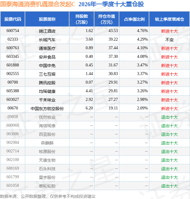 从基金规模来看,国泰海通消费机遇混合发起C基金2026年一季度公布的基金规模为0.02亿元,较上一期规模337.12万元变化了-137.7万元,环比变化了-40.85%。该基金最新一期资产配置为:股票占净值比90.58%,无债券类资产,现金占净值比9.61%。从基金持仓来看,该基金当季前十大股票仓位达35.67%,第一大重仓股为锦江酒店(600754),持仓占比为4.76%。