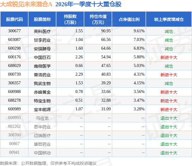 从基金规模来看,大成锐见未来混合A基金2026年一季度公布的基金规模为0.09亿元,较上一期规模2632.18万元变化了-1756.02万元,环比变化了-66.71%。该基金最新一期资产配置为:股票占净值比81.87%,无债券类资产,现金占净值比9.17%。从基金持仓来看,该基金当季前十大股票仓位达53.07%,第一大重仓股为英科医疗(300677),持仓占比为9.61%。
