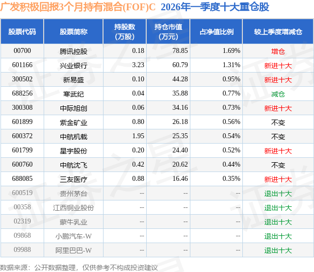 从基金规模来看,广发积极回报3个月持有混合(FOF)C基金2026年一季度公布的基金规模为0.28亿元,较上一期规模1760.15万元变化了1074.58万元,环比变化了61.05%。该基金最新一期资产配置为:股票占净值比10.24%,债券占净值比4.52%,现金占净值比1.59%。从基金持仓来看,该基金当季前十大股票仓位达7.86%,第一大重仓股为腾讯控股(00700),持仓占比为1.69%。